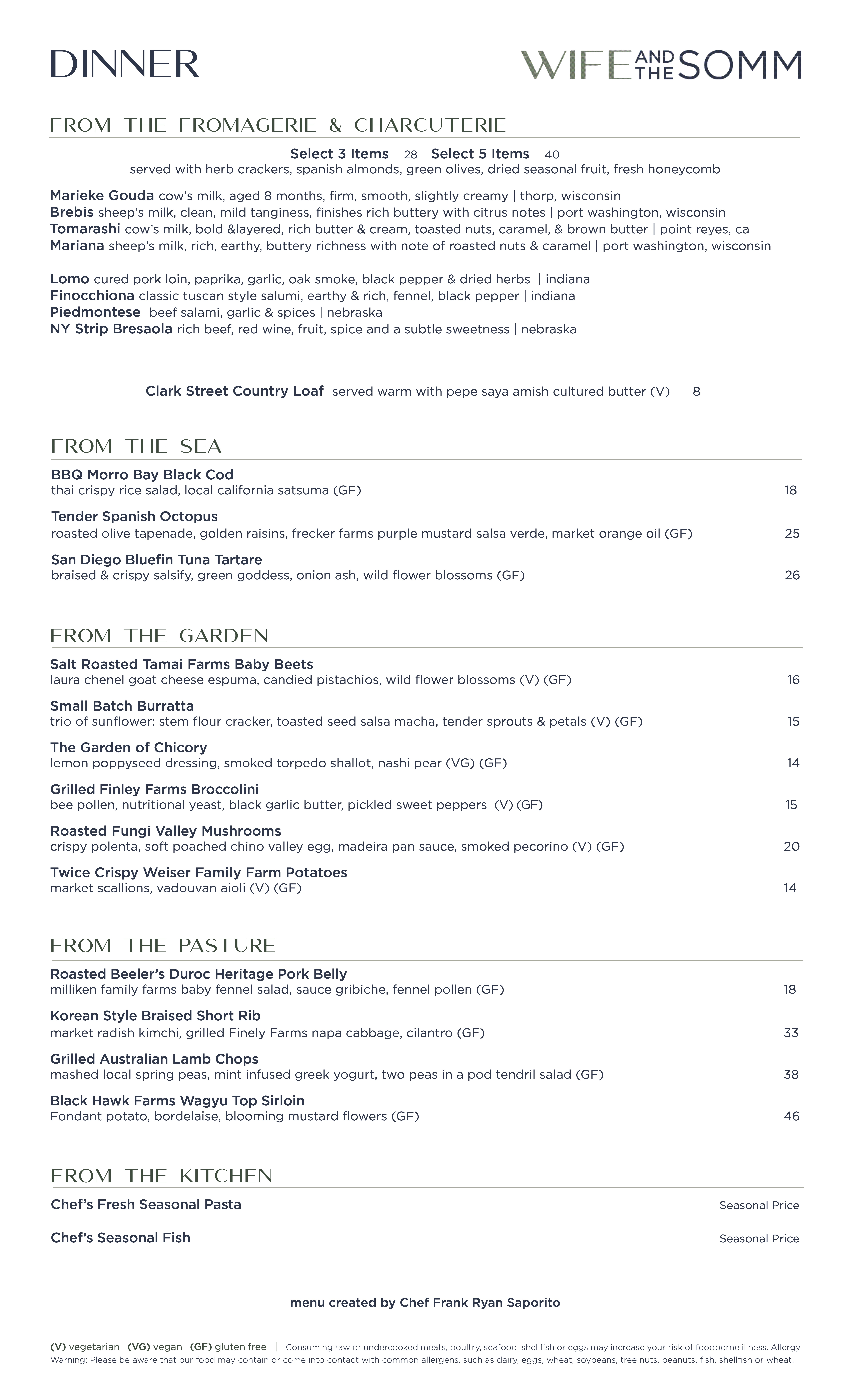 offering fresh light bites to a full seasonal dinner starting in the late afternoon, Wife and the Somm is the perfect place to relax and unwind in a comfortable, inviting space. with a strong by-the-glass program and value-driven pricing, our husband and wife team has created a menu with a variety of price points.