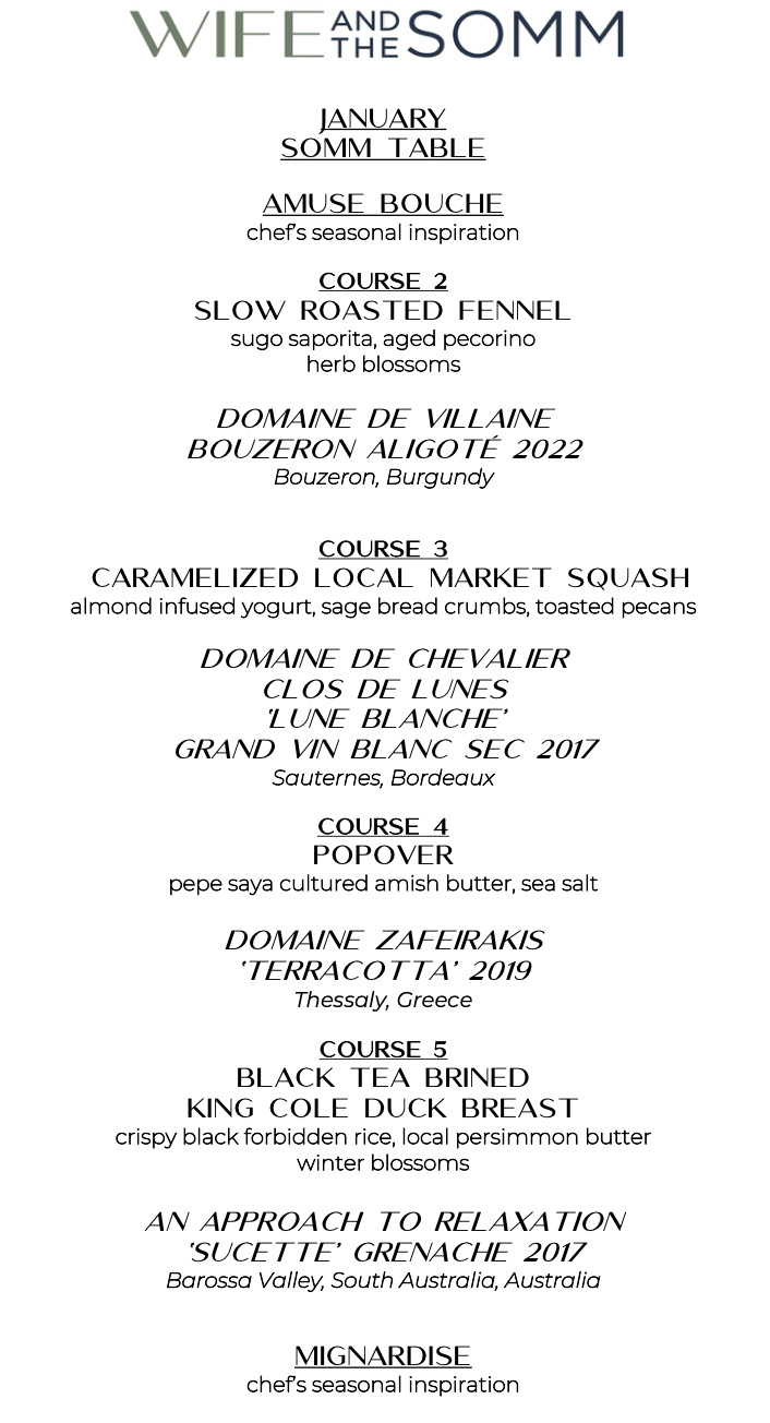 offering fresh light bites to a full seasonal dinner starting in the late afternoon, Wife and the Somm is the perfect place to relax and unwind in a comfortable, inviting space. with a strong by-the-glass program and value-driven pricing, our husband and wife team has created a menu with a variety of price points.